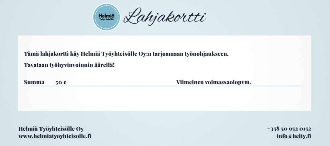 Työnohjauslahjakortin arvo on aina 50€. Tilaa lahjakortti omilla tiedoillasi - ja toimitamme sähköisen lahjakortin tiedot sinulle sähköpostitse.